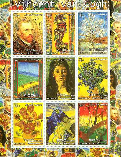 Left: A miniature sheet of postage stamps depicting some of van Gogh’s famous paintings, issued by Somalia in 2002.