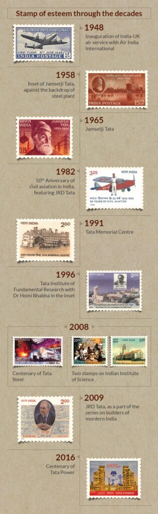 The Tata Group has been featured on several commemorative stamps issued by the Department of Posts over the years, reflecting the conglomerate’s role in nation-building.