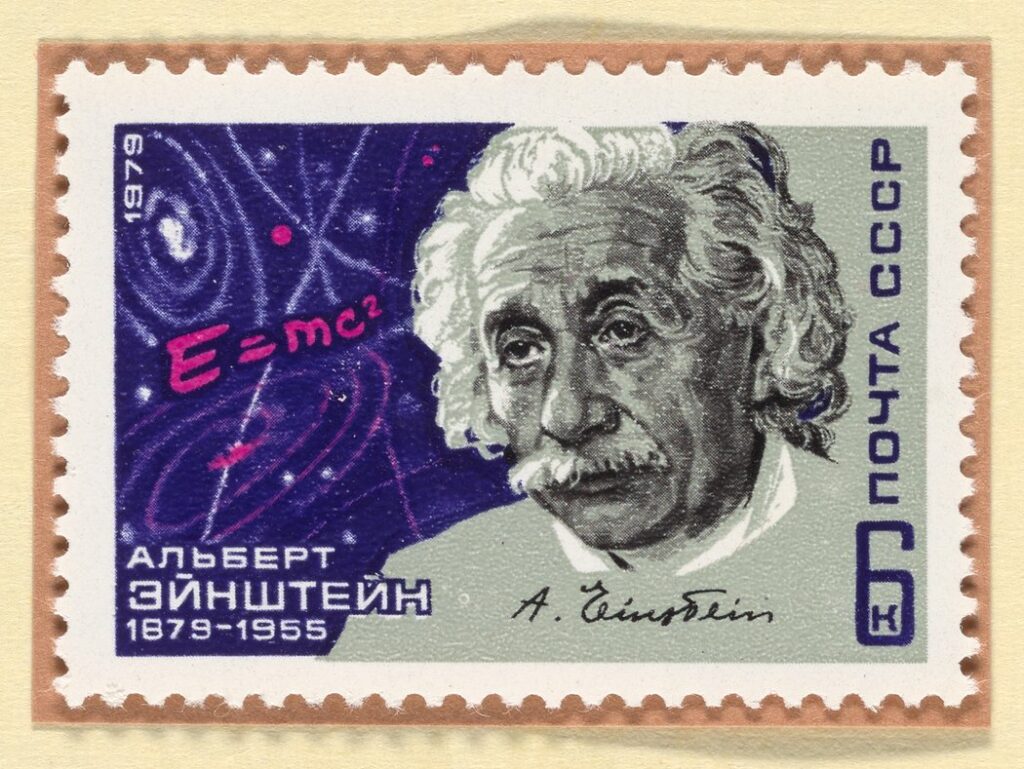 Image above: A vintage Soviet (USSR/CCCP) postage stamp from 1979 issued to honour Albert Einstein (1879-1955) on his 100th birth anniversary. The stamp features his signature as well as his famous mass-energy equivalence formula, 𝐸=𝑚𝑐2 . Courtesy Science History Institute, Philadelphia.
