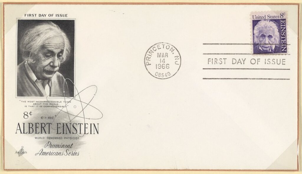 A first day cover commemorating Albert Einstein issued by USA in 1966. The cachet and stamp depict Albert Einstein. The cachet also depicts Einstein’s formula for mass-energy equivalence and is from the Prominent Americans Series. The postmark is from Princeton, New Jersey. Courtesy Science History Institute, Philadelphia.