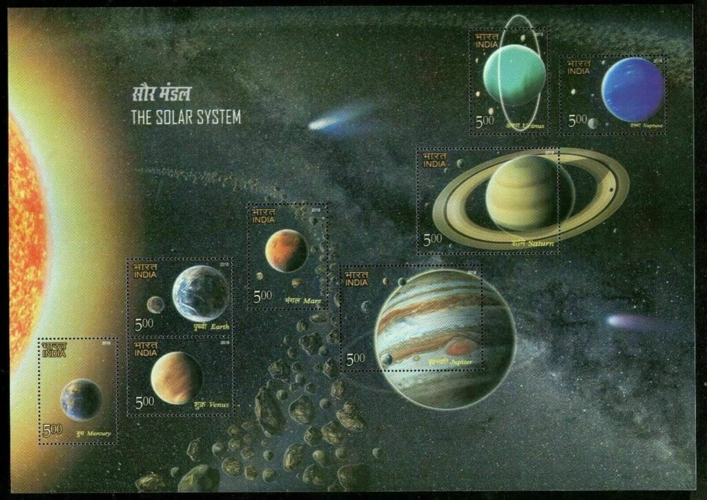 The Solar System, a miniature sheet containing eight stamps depicting the eight planets, issued by India Post in 2018.