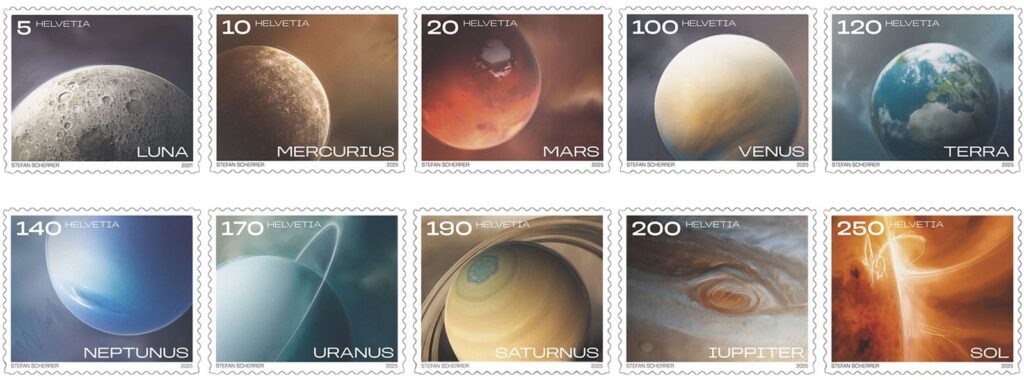 Image above: A new set of stamps from Switzerland in 2025 features our fascinating solar system in an impressive way. The designs in the set include the eight planets, the sun and the moon – the main representatives of our solar system. Courtesy Swiss Post.