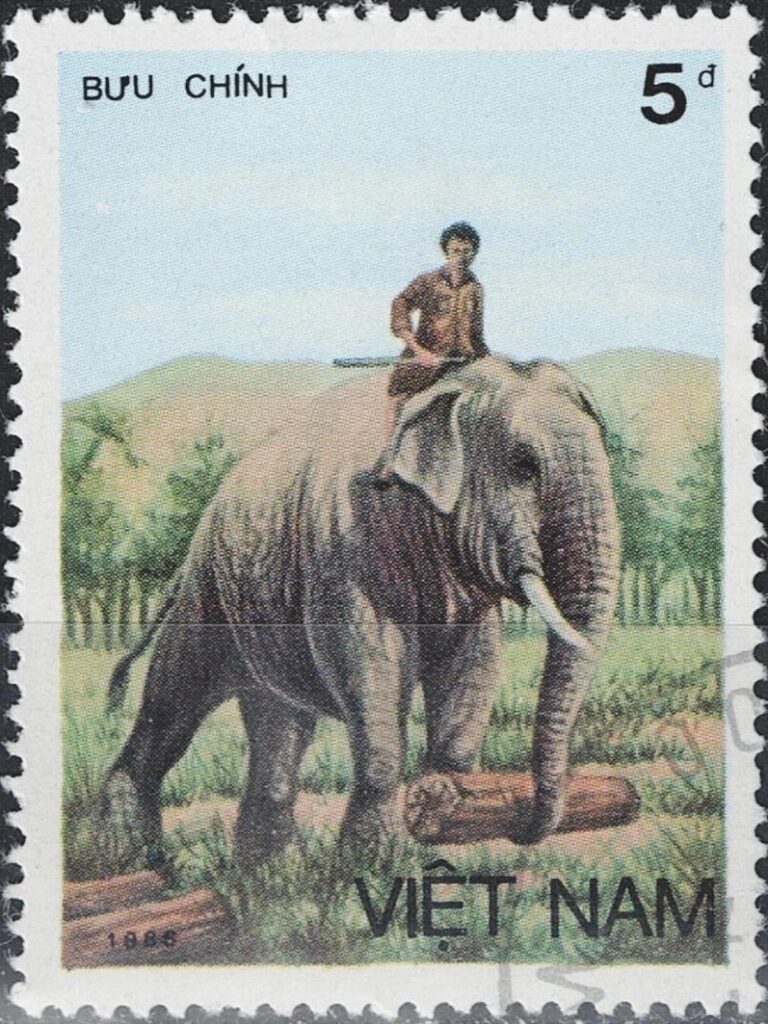 Image: A 1986 postage stamp from Vietnam depicts an elephant transporting timber under the guidance of its caretaker.